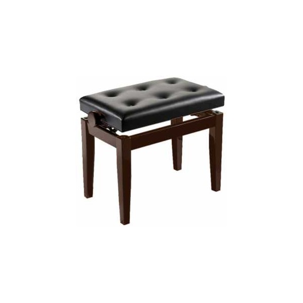 Banqueta de madera satinada para piano regulable en altura. Tapizada en skay capitone (con botones). Acabado madera palisandro, tapiz negro.