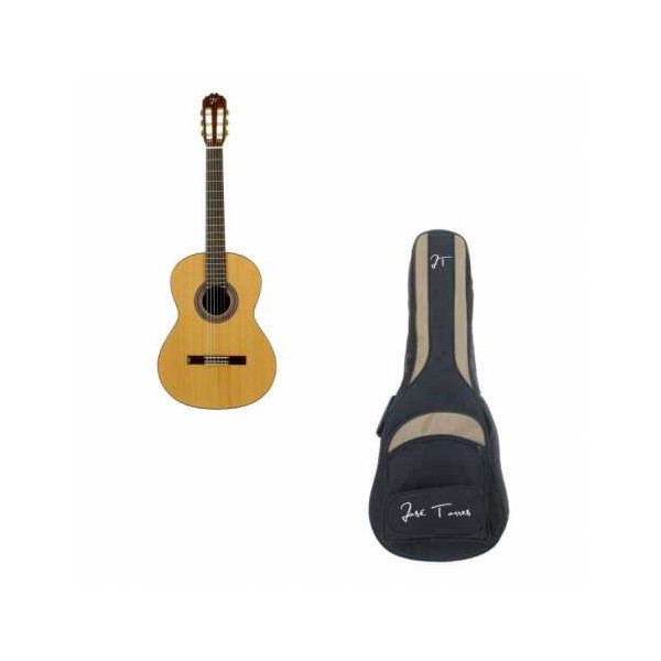 Pack formado por guitarra clásica JTC-20 y funda acolchada JTB-100. Guitarra JTC-20: Tapa maciza de cedro. Aros y fondo de caoba. Mástil de caoba. Diapasón de palosanto de la India. Cejilla de hueso. Clavijero plateado en niquel. Ribeteado de arce en la tapa. Acabado brillante. Funda José Torres JTB-100 para guitarra clásica. Acolchado de 20mm de alta densidad. 3 bolsillos frontales. Asa de mano para transporte. Correas acolchadas ajustables tipo mochila. Sistema de sujeción interna para mayor seguridad. Logos bordados.